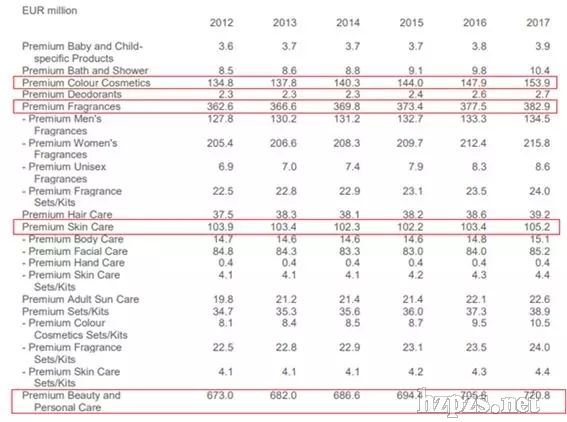 2012~2017年高端化妝品市場規(guī)模增長7.1%,2017年達(dá)到7億2080萬歐元,主要商品種類有香水,銷售額3億829萬歐元,女性香水占比很高。