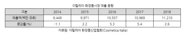 KOTRA意大利米蘭貿(mào)易官Yu Jiyun表示,據(jù)意大利化妝品產(chǎn)業(yè)協(xié)會(Cosmetica Italia)數(shù)據(jù)統(tǒng)計,2018年意大利化妝品市場銷售總額共計112.1億歐元,同比增長1.3%。