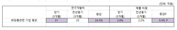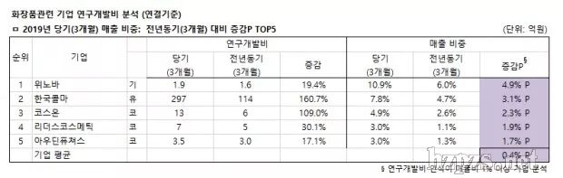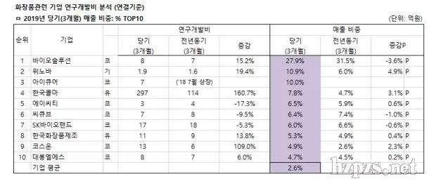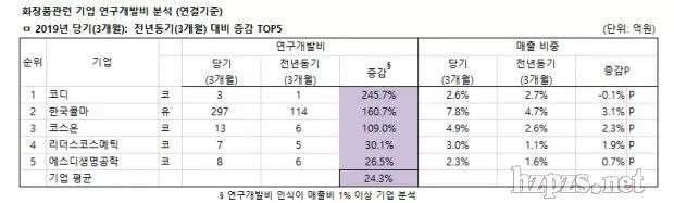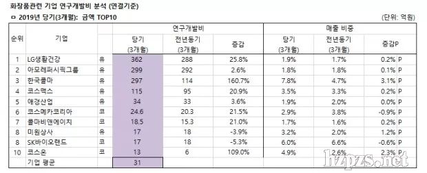 By beautynury 0 Comment第1季度平均投入研發(fā)費(fèi)31億韓元,占銷售額比重增長0.4%  韓國與化妝品有關(guān)的上市企業(yè)第1季度研發(fā)費(fèi)用平均投入31億韓元,較去年同期的25億韓元,大幅增長24.3%,占銷售比重也由上季度的2.2%,提高了0.4%,達(dá)到2.6%。  韓國化妝品新聞(富體美麗)與藥業(yè)新聞對(duì)韓國46家上市化妝品企業(yè)(KOSPI 12家,KOSDAQ 27家,其它7家)今年第1季度的研發(fā)費(fèi)用進(jìn)行了分析,TOP10家企業(yè)中,LG生活健康以362億韓元位居第一,第二、第三分別是愛茉莉太平洋299億韓元、韓國科瑪297億韓元,其后依次是科絲美詩115億韓元,愛敬產(chǎn)業(yè)34億韓元,COSMECCA KOREA研發(fā)投入24.6億韓元,KolmarBNH投入18.5億韓元,美源商事17億韓元,SK Bioland投入17億韓元,COSON投入13億韓元。LG生活健康第1季度累計(jì)研發(fā)費(fèi)用較去年同期增加74億韓元,韓國科瑪因收購CJ Healthcare,研發(fā)較去年同期增加183億韓元。 科絲美詩控股企業(yè)科絲美詩韓國法人增加14億韓元,導(dǎo)致整體研發(fā)較去年同期增加20億韓元,COSMECCA KOREA因費(fèi)用確認(rèn)產(chǎn)生4億韓元費(fèi)用,導(dǎo)致研發(fā)較去年同期增加4億韓元。 KolmarBNH因政府補(bǔ)貼調(diào)整增加1億韓元,導(dǎo)致研發(fā)費(fèi)較去年同期增加3億韓元,COSON因費(fèi)用確認(rèn)產(chǎn)生7億韓元費(fèi)用,研發(fā)較去年同期增加7億韓元,GLOBON、GDK COSMETICS、Cosmelab等未公開相關(guān)數(shù)據(jù)。  較去年同期增長最快的TOP5企業(yè)中,增長245.7%的KODI位居第一,第二是增長160.7%的韓國科瑪,COSON增長109.0%位居第三,第四和第五分別是增長30.1%、26.5%的麗得姿化妝品和SD生命工學(xué),企業(yè)平均較去年同期增長24.3%。  KODI因費(fèi)用確認(rèn)增加2億韓元,導(dǎo)致研發(fā)費(fèi)較去年同期增加2億韓元。 麗得姿化妝品因費(fèi)用確認(rèn)增加2億韓元,研發(fā)較去年同期增加2億韓元。 SD生命工學(xué)因費(fèi)用確認(rèn)增加2億韓元,研發(fā)較去年同期增加2億韓元。 研發(fā)費(fèi)占銷售比重最高的TOP10企業(yè)分別是:Bio Solutions占27.9%,WINNOVA占10.9%,icure占10.0%,韓國科瑪占7.8%,ACT占6.5%,CQV占6.4%,SK Bioland占6.0%,韓國化妝品制造占5.3%,COSON占4.9%,DAEBONG LS占4.7%,46家企業(yè)研發(fā)費(fèi)用平均占銷售總額的2.6%。  與去年同期相比,平均占銷售額比重增加0.4%,占銷售額比重較去年同期增長最快的TOP5企業(yè)分別是:WINNOVA占銷售額比重較去年同期增加2.9%,COSON增加2.3%,麗得姿化妝品增加1.9%,OUTINFUTURES增加1.7%。 WINNOVA因銷售額減少,當(dāng)季費(fèi)用增加,導(dǎo)致研發(fā)費(fèi)較去年同期小幅上漲。  OUTINFUTURES因費(fèi)用確認(rèn)產(chǎn)生1億韓元費(fèi)用,導(dǎo)致研發(fā)費(fèi)較去年同期增加1億韓元。