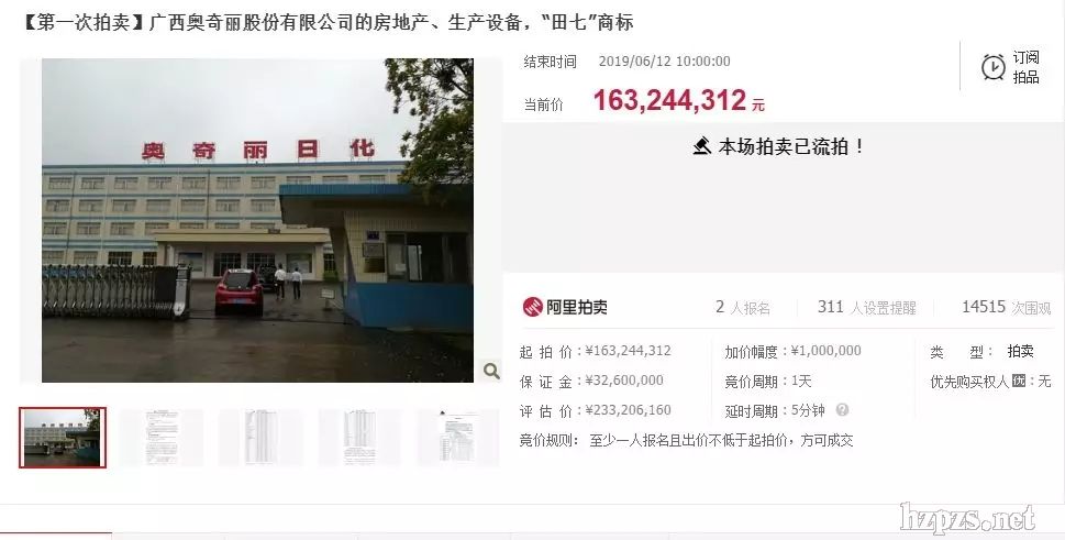 來源:北京商報(bào)  僅2人報(bào)名參加,但無一人報(bào)價(jià),最終流拍。 6月12日,阿里拍賣平臺(tái)顯示,關(guān)于田七商標(biāo)及設(shè)備地產(chǎn)等資產(chǎn)第一次拍賣已于6月12日10點(diǎn)結(jié)束,被圍觀1.3萬(wàn)次,設(shè)置提醒人數(shù)311人,僅2人報(bào)名參加,但無一人報(bào)價(jià),最終流拍。其母公司廣西奧奇麗股份有限公司(以下簡(jiǎn)稱“奧奇麗”)旗下13個(gè)商標(biāo)也在此次拍賣中流拍。 針對(duì)網(wǎng)友關(guān)于流拍后是否會(huì)降價(jià)的提問,阿里拍賣官方微博回應(yīng)稱,二次拍賣通常會(huì)降價(jià),但是降價(jià)幅度不會(huì)超過一拍起拍價(jià)20%,在此范圍內(nèi)的具體降價(jià)金額由法院裁決,具體情況以二次拍賣實(shí)際頁(yè)面為準(zhǔn)。但是如果本已壓價(jià)處理,也存在維持一拍價(jià)格的可能。 根據(jù)拍賣公告,田七商標(biāo)被奧奇麗打包拍賣,拍賣涉及奧奇麗所有的位于梧州市園區(qū)一路1號(hào)土地使用權(quán)、梧州市旺甫外向型工業(yè)園區(qū)A7、A8土地使用權(quán)及地上的房屋、建筑物;牙膏、濕巾生產(chǎn)設(shè)備;田七57個(gè)商標(biāo)。參與拍賣的全部財(cái)產(chǎn)評(píng)估總價(jià)為2.33億元,起拍價(jià)為1.63億元。同時(shí),奧奇麗的“建國(guó)、衛(wèi)齒寶、愛爾齒、川參、里外、奧奇麗”等13個(gè)商標(biāo)整體也將進(jìn)行網(wǎng)絡(luò)公開拍賣,評(píng)估價(jià)為409.56萬(wàn)元,起拍價(jià)286.692萬(wàn)元。 據(jù)悉,田七母公司奧奇麗成立于1945年,2002年被哈爾濱曉升集團(tuán)收購(gòu),2014年因財(cái)務(wù)成本增加、資金短缺被迫停產(chǎn)。2016年資產(chǎn)重組,由上海欽聯(lián)控股集團(tuán)有限公司和廣西金控出資1.4億元設(shè)立了廣西田七公司,其營(yíng)運(yùn)中心、科研中心轉(zhuǎn)移至上海,成立上海田七日化科技有限公司。 天眼查數(shù)據(jù)顯示,奧奇麗的失信記錄23條,被列為執(zhí)行人14次,受過兩次行政處罰和環(huán)保處罰。 |