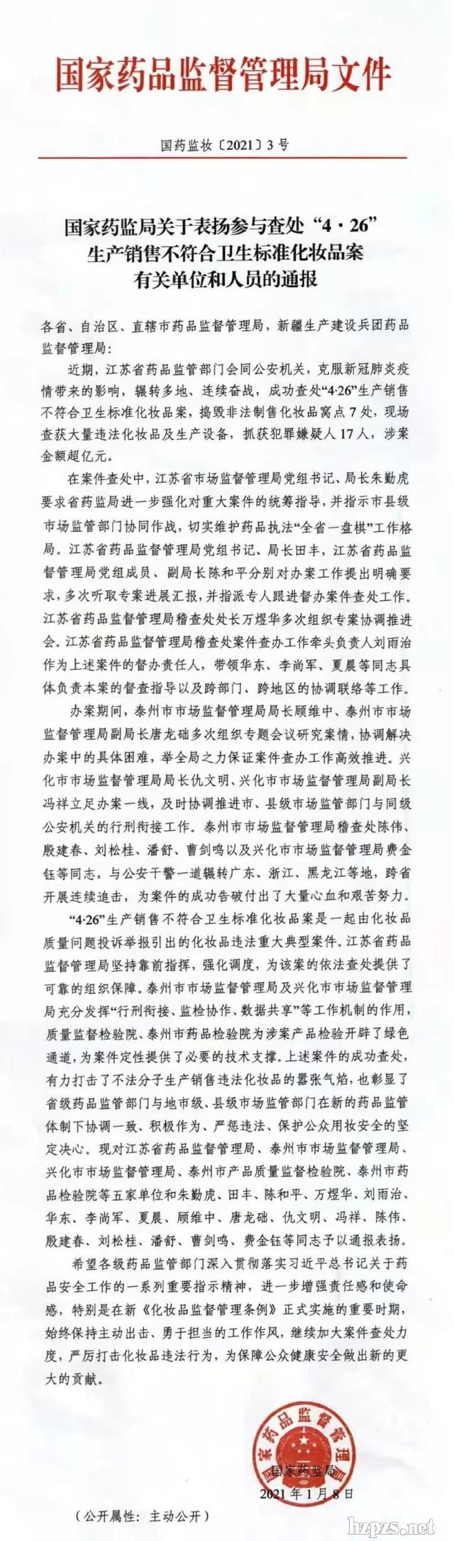 江蘇泰州破獲一起典型假化妝品案,獲國家藥監(jiān)局公開表揚(yáng)2021-1-14 10:33:59 來源:澎湃新聞 閱讀數(shù):