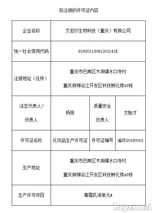 經(jīng)艾伯爾生物科技(重慶)有限公司申請(qǐng),依據(jù)《中華人民共和國(guó)行政許可法》第七十條、《化妝品生產(chǎn)經(jīng)營(yíng)監(jiān)督管理辦法》第二十三條的規(guī)定,我局?jǐn)M注銷艾伯爾生物科技(重慶)有限公司《化妝品生產(chǎn)許可證》,證書內(nèi)容詳見附件,F(xiàn)予公示,請(qǐng)社會(huì)各界予以監(jiān)督,公示日期自2023年4月28日至2023年5月4日,如公示期內(nèi)無(wú)相關(guān)單位或個(gè)人提出異議,我局將正式注銷其《化妝品生產(chǎn)許可證》。 監(jiān)督電話:023-60353759 傳真:023-60353733。 通訊地址:重慶市渝北區(qū)食品城大道27號(hào) 郵編:401120 附件:擬注銷的許可證內(nèi)容 重慶市藥品監(jiān)督管理局 2023年4月28日 附件: