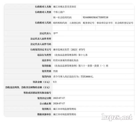 近日,信用中國(廣東湛江)網站發(fā)布一條處罰信息,涉及廉江市城北薈美美容店,該店經營未備案的普通化妝品。具體信息如下:
