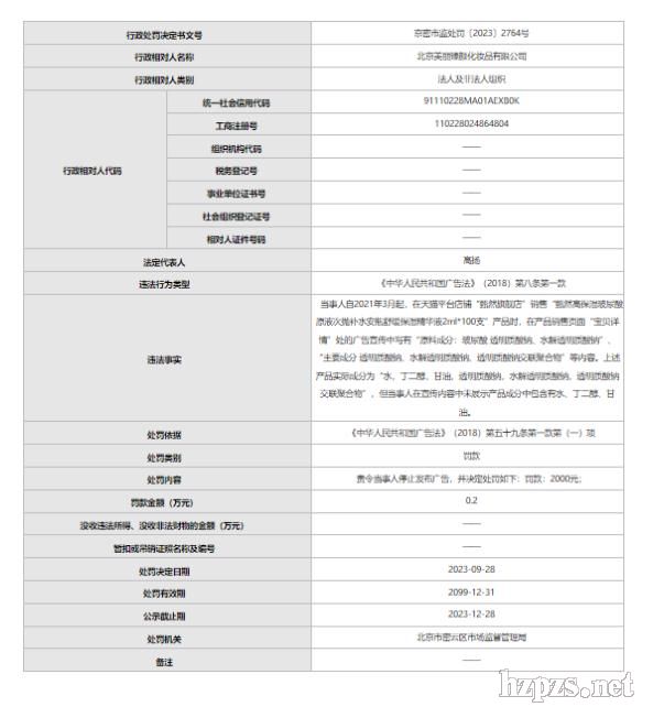 中國網(wǎng)財經(jīng)10月8日訊(記者 劉小菲)北京市市場監(jiān)督管理局近期發(fā)布的消息顯示,北京美麗臻顏化妝品有限公司違反廣告法被處罰。 根據(jù)處罰信息,自2021年3月起,北京美麗臻顏化妝品有限公司在天貓平臺店鋪“甄然旗艦店”銷售“甄然高保濕玻尿酸原液次拋補(bǔ)水安瓶舒緩保濕精華液2ml*100支”產(chǎn)品時,在產(chǎn)品銷售頁面“寶貝詳情”處的廣告宣傳中寫有“原料成分:玻尿酸 透明質(zhì)酸鈉、水解透明質(zhì)酸鈉”、“主要成分 透明質(zhì)酸鈉、水解透明質(zhì)酸鈉、透明質(zhì)酸鈉交聯(lián)聚合物”等內(nèi)容。 上述產(chǎn)品實(shí)際成分為“水,丁二醇,甘油,透明質(zhì)酸鈉,水解透明質(zhì)酸鈉,透明質(zhì)酸鈉交聯(lián)聚合物”,但北京美麗臻顏化妝品有限公司在宣傳內(nèi)容中未展示產(chǎn)品成分中包含有水、丁二醇、甘油。 根據(jù)《中華人民共和國廣告法》(2018)第五十九條第一款第(一)項(xiàng),北京市密云區(qū)市場監(jiān)督管理局責(zé)令北京美麗臻顏化妝品有限公司停止發(fā)布廣告,并罰款2000元。 天貓平臺店鋪“甄然旗艦店”的內(nèi)容顯示,甄然高保濕玻尿酸原液次拋補(bǔ)水安瓶舒緩保濕精華液2ml*100支的價格為1199元。目前“寶貝詳情”處的廣告宣傳中只提到了“核心成分“透明質(zhì)酸鈉、水解透明質(zhì)酸鈉、透明質(zhì)酸鈉交聯(lián)聚合物”。 北京美麗臻顏化妝品有限公司官網(wǎng)資料顯示,公司創(chuàng)始人Frank,于2018年創(chuàng)立甄然品牌,并研發(fā)推出一款產(chǎn)品一甄然高保濕玻尿酸原液。  責(zé)任編輯:張博華