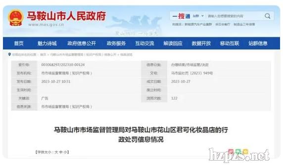 馬鞍山市市場(chǎng)監(jiān)督管理局對(duì)馬鞍山市花山區(qū)君可化妝品店的行政處罰信息情況