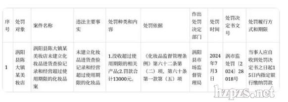 內(nèi)容顯示,渦陽縣陳大鎮(zhèn)某美妝店未建立化妝品進(jìn)貨查驗(yàn)記錄和經(jīng)營(yíng)超過使用期限的化妝品被罰款1.3萬元。