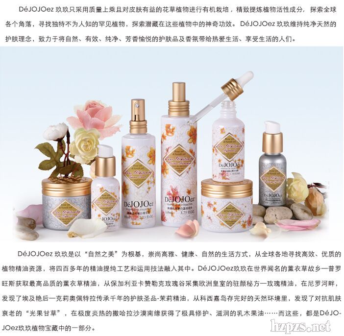 法國玖玖化妝品有限公司的前身是法國古城格拉斯最享有盛名的香熏世家之一,芳香古城格拉斯——位于美麗的普羅旺斯蔚藍海岸,是當今世界出產(chǎn)最優(yōu)質(zhì)頂級芳香精油的著名盛地。長久以來,DeJOJOez對所用的植物成份精心挑選,只采用質(zhì)量上乘及對人類皮膚有益的花草植物進行有機栽培,精致提煉植物活性成份,維持純真天然的護膚理念。DeJOJOez的頂級精油是世界多家奢華芳療中心唯一采納使用的芳香理療產(chǎn)品,也是宮廷貴胄、時尚名媛的閣中至愛。
