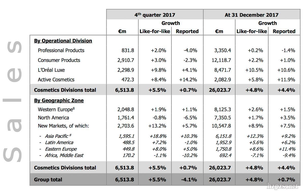 楊濤聲 2月8日,法國(guó)美妝巨頭歐萊雅集團(tuán)(L’Oreal)公布 2017財(cái)年第四季度和全年財(cái)報(bào)。截至2017年12月31日的第四季度,受 The Body Shop(美體小鋪)出售后的影響,歐萊雅集團(tuán)銷(xiāo)售額為65.1億歐元,同比下降4.1%;可比銷(xiāo)售額同比增長(zhǎng)5.5%,高于路透社調(diào)析師預(yù)期的5%,主要得益于奢華產(chǎn)品部門(mén)和亞洲市場(chǎng)的強(qiáng)勁表現(xiàn)。 2017財(cái)年,歐萊雅集團(tuán)全年核心財(cái)務(wù)數(shù)據(jù)如下: 銷(xiāo)售額 260.2億歐元,同比增長(zhǎng)0.7%,按不變匯率計(jì)增長(zhǎng) 2%,可比銷(xiāo)售額同比增長(zhǎng)4.8% 經(jīng)營(yíng)利潤(rùn)46.8億歐元,占銷(xiāo)售額的18% 每股收益6.65歐元,同比增長(zhǎng)3% 凈現(xiàn)金流39.7億歐元,同比增長(zhǎng)19.6% 股息3.55歐元,同比增長(zhǎng) 7.6%  按部門(mén) 專(zhuān)業(yè)產(chǎn)品 該部門(mén)銷(xiāo)售額同比下降1.4%,可比銷(xiāo)售額同比增長(zhǎng)0.2%。 該部門(mén)銷(xiāo)售額在經(jīng)歷了2017財(cái)年上半年的下滑后,在下半年逐漸改善,美國(guó)和亞太地區(qū)市場(chǎng)大幅復(fù)蘇,東歐和拉丁美洲市場(chǎng)保持增長(zhǎng)勢(shì)頭。 染發(fā)產(chǎn)品中核心授權(quán)經(jīng)銷(xiāo)品牌 Redken(Shades Eq)表現(xiàn)強(qiáng)勁。 護(hù)發(fā)品牌中 L’Oréal Professionnel 推出的 Série Expert、卡詩(shī)(Kérastase)天然系列 Aura Botanica 和 Biolage R.A.W. 延續(xù)了突出表現(xiàn)。 大眾產(chǎn)品 該部門(mén)銷(xiāo)售額同比增長(zhǎng)1%,可比銷(xiāo)售額同比增長(zhǎng)2.2%。電商業(yè)務(wù)在中國(guó)市場(chǎng)的推動(dòng)下已經(jīng)占據(jù)了三分之一以上的銷(xiāo)售額,繼續(xù)成為增長(zhǎng)的催化劑。 該部門(mén)在西歐、東歐和美國(guó)西語(yǔ)區(qū)表現(xiàn)強(qiáng)勁,北美市場(chǎng)陷入疲軟,增長(zhǎng)放緩。在第四季度中,由于中國(guó)市場(chǎng)的良好表現(xiàn),亞洲市場(chǎng)持續(xù)增長(zhǎng)。 彩妝品類(lèi)持續(xù)增長(zhǎng),NYX Professional Makeup 正在快速增長(zhǎng)并擴(kuò)大其全球擴(kuò)張。L’Oréal Makeup Designer Paris 表現(xiàn)良好(其 Lash Paradise 睫毛膏尤其成功),在美國(guó)排名第二,僅次于市場(chǎng)領(lǐng)導(dǎo)者 Maybelline(美寶蓮)。 染發(fā)品類(lèi)在 L’Oréal Paris(巴黎歐萊雅)Colorista 系列和 Magic Retouch 的推動(dòng)下不斷增長(zhǎng)。 護(hù)膚品類(lèi)中,Gariner(卡尼爾)推出的 Micellar Cleansing Waters 潔膚水以及 L’Oréal Paris(巴黎歐萊雅)推出的泥質(zhì)面膜 Pure Clay Masks 廣受歡迎。 奢華產(chǎn)品 得益于彩妝和面部護(hù)理產(chǎn)品的強(qiáng)勢(shì)增長(zhǎng),該部門(mén)銷(xiāo)售額同比增長(zhǎng)10.5%,可比銷(xiāo)售額同比增長(zhǎng)10.6%。 該部門(mén)在亞太地區(qū)的銷(xiāo)售額實(shí)現(xiàn)了雙位數(shù)增長(zhǎng)(特別是中國(guó)市場(chǎng)和旅游零售的銷(xiāo)售數(shù)據(jù)尤為突出),西歐市場(chǎng)也表現(xiàn)良好。電商業(yè)務(wù)增長(zhǎng)非常強(qiáng)勁。 Lancôme(蘭蔻)銷(xiāo)售額實(shí)現(xiàn)了雙位數(shù)增長(zhǎng),得益于 Monsieur Big 睫毛膏、L’Absolu Rouge 口紅、 Teint Idole Ultra 粉底和 Génifique 精華肌底液的推動(dòng)。La Vie est Belle 香水銷(xiāo)售獲得歐洲第一。 Yves Saint Laurent(伊夫·圣洛朗)憑借香水系列的成功打破更多紀(jì)錄,新推出的男香系列 Y 和 Tatouage Couture 唇膏表現(xiàn)突出。 Giorgio Armani (喬治·阿瑪尼)和 Kiehl’s(科顏氏)的銷(xiāo)售額均超過(guò)10億歐元大關(guān),新加入的 IT Cosmetics 持續(xù)快速增長(zhǎng)。 活性美容 2017年是該部門(mén)歷史性的一年,銷(xiāo)售額同比增長(zhǎng)11.9%,可比銷(xiāo)售額同比增長(zhǎng)5.8%,突破20億歐元大關(guān),同時(shí)進(jìn)一步加強(qiáng)了集團(tuán)在全球活性化妝品市場(chǎng)的領(lǐng)導(dǎo)地位。 該部門(mén)的全球擴(kuò)張仍在繼續(xù),CeraVe 在美國(guó)市場(chǎng)強(qiáng)勢(shì)增長(zhǎng),SkinCeuticals 和 La Roche-Posay(理膚泉)也保持良好的增長(zhǎng)勢(shì)頭。美國(guó)地區(qū)是增長(zhǎng)的最大貢獻(xiàn)者,并成為該部門(mén)的頭號(hào)市場(chǎng)。此外,電商業(yè)務(wù)也在繼續(xù)增長(zhǎng)。 La Roche-Posay(理膚泉)保持強(qiáng)勁的增長(zhǎng)勢(shì)頭,Cicaplast 舒緩修復(fù)乳、Effaclar 凈膚清痘系列和 Lipikar 全效修護(hù)系列廣受好評(píng)。 Vichy(薇姿)在第四季度表現(xiàn)出色,特別在西歐和亞洲市場(chǎng),Minéral 89 微精華露和 Neovadiol Rose Platinium 抗皺紋面霜熱賣(mài)。 SkinCeuticals 連續(xù)第八年獲得兩位數(shù)增長(zhǎng), H.A. Intensifier 素顏飽滿(mǎn)精致精華獲得了巨大成功。 按地區(qū) 西歐 該市場(chǎng)銷(xiāo)售額同比增長(zhǎng)1.5%,可比銷(xiāo)售額同比增長(zhǎng)2.6%。 英國(guó)、西班牙和德國(guó)市場(chǎng)受到美妝產(chǎn)品和護(hù)膚產(chǎn)品的推動(dòng),增長(zhǎng)尤為強(qiáng)勁。法國(guó)市場(chǎng)的銷(xiāo)售繼續(xù)受到市場(chǎng)萎縮的阻礙。 大眾產(chǎn)品部門(mén)和奢華產(chǎn)品部門(mén)跑贏大盤(pán),活性美容部門(mén)在本財(cái)年下半年加快增長(zhǎng)。 北美 該市場(chǎng)銷(xiāo)售額同比增長(zhǎng)3.5%,可比銷(xiāo)售額同比增長(zhǎng)1.7%。 美國(guó)市場(chǎng)繼續(xù)增長(zhǎng),但一些歷史悠久的分銷(xiāo)渠道正