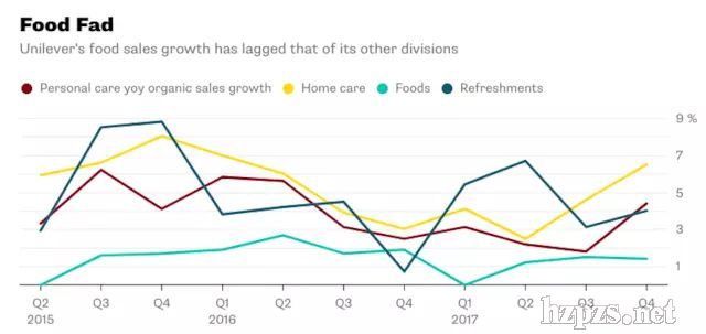 彭博認(rèn)為改成單一總部后,聯(lián)合利華可能會(huì)進(jìn)一步收購(gòu)以擴(kuò)大個(gè)人護(hù)理產(chǎn)品業(yè)務(wù)范圍(美國(guó)公司高露潔棕欖和雅詩(shī)蘭黛都有可能成為收購(gòu)對(duì)象)。而為了避免成為類(lèi)似去年卡夫亨氏的惡意收購(gòu),它可能會(huì)賣(mài)掉增速最慢的食品部門(mén)。