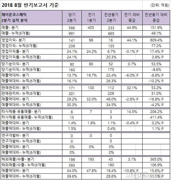根據(jù)《2018年8月年中報(bào)告》,JAYJUN化妝品2季度銷(xiāo)售額586億韓元,分別較上季度和去年同期增加182億韓元、353億韓元。特別是韓國(guó)內(nèi)需市場(chǎng)銷(xiāo)售額較上季度拿著國(guó)家175億韓元,較去年同期增加195億韓元,牽引了銷(xiāo)售額的增長(zhǎng)趨勢(shì);瘖y品出口額較去年同期增加157億韓元。