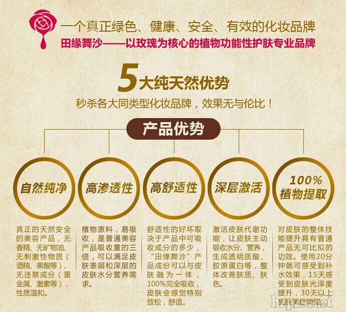 田緣舞沙一直倡導(dǎo)真正的自然萃取、精準護膚,緊緊圍繞“玫瑰、高貴、典雅、綠色、天然”的理念,其物超所值的優(yōu)質(zhì)產(chǎn)品都是從純天然鮮花、百草等植物中萃取天然元素精制而成,盡顯“健康、清新、自然、綠色”的全新感覺。