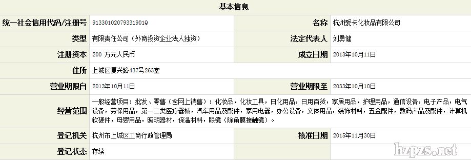 杭州愛卡化妝品有限公司 梁瑞全 先生 地 址: 四季青街道新業(yè)路8號華聯(lián)時代大廈B座12F