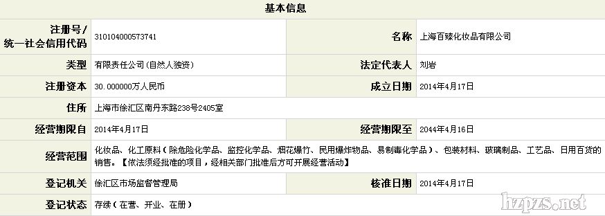 上海百臻化妝品有限公司 百臻 地 址: 上海市徐匯區(qū)田林路140號16-E2樓乙