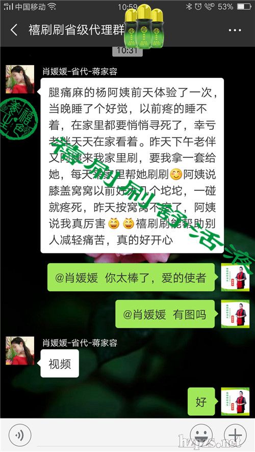 媛媛說(shuō):腿痛麻的楊阿姨前天體驗(yàn)了一次禧刷刷舒活液,當(dāng)晚睡了個(gè)好覺,以前疼的睡不著,在家里都要悄悄尋死了,幸虧老伴天天在家看著。昨天下午老伴又帶阿姨來(lái)我家里刷,還要我拿一套給她,每天來(lái)家里幫她刷刷,阿姨說(shuō)膝蓋窩窩以前好大幾個(gè)坨坨,一碰就疼死,昨天按窩窩不疼了,阿姨說(shuō)我真厲害禧刷刷能幫助別人減輕痛苦,真的好開心!