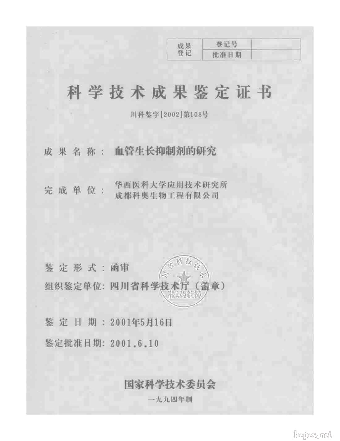 科學(xué)技術(shù)成果鑒定證書(血管生長研究)